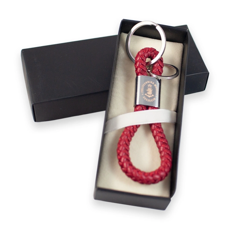 Gustowny brelok wykonany z eko skóry w kształcie liny, ozdobiony pięknym grawerem z logo Politechniki Morskiej w Szczecinie